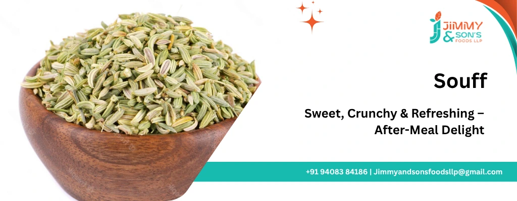 Jimmy & Sons offers premium-quality Roasted Fennel Seeds (Souff) known for their sweet aroma, crunchy texture, and digestive benefits. Sourced from trusted farms and expertly roasted to enhance flavor and freshness, our Roasted Souff is ideal as a mouth freshener, post-meal digestive, or ingredient in sweet and savory snacks. Crafted to meet global food safety standards, it’s a perfect blend of tradition, taste, and wellness.